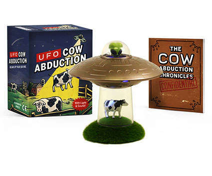-Miniature cow and faux grass mound -Transparent display stand to hover spaceship over cow when not invading the countryside -32-page book, The Cow Abduction Chronicles, featuring full-color illustrations